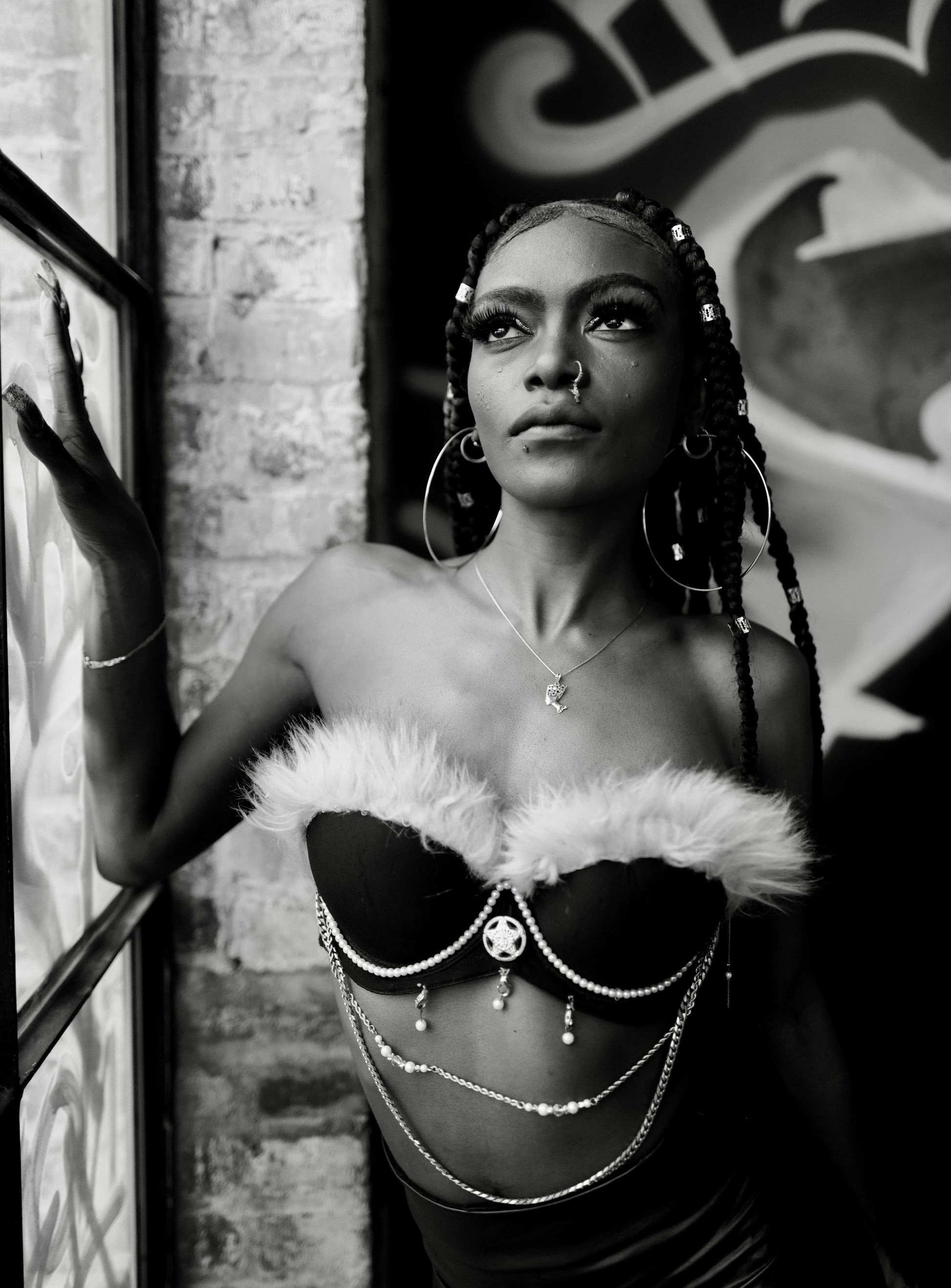 Black/White Photograph - Young Woman with Fur Trimmed Bustier